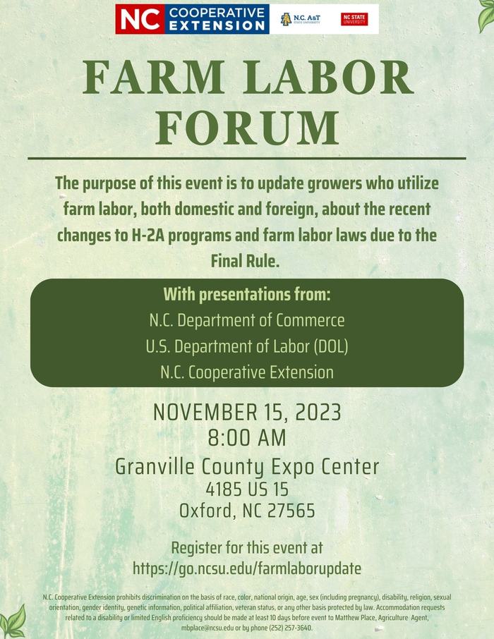 Registration is required. Register by going to go.ncsu.edu/farmlaborupdate or by calling the N.C. Cooperative Extension, Granville County Office at 919-603-1350.